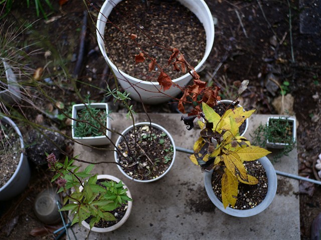 ちなみに黄色く紅葉してるのがレモンクイーン、残りの丸鉢はコバルトセージです。